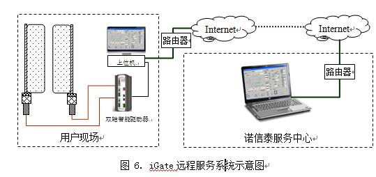 为了给用户提供更好更及时的服务,方便系统的调试和减少设备停机时间,诺信泰服务中心提供了iGate的远程服务,用于系统的远程调试调试和故障诊断。远程服务系统的结构如下图所示,用户只需将连接驱动器的上位机连接到网络。在现场用户的授权下,诺信泰服务中心的专家就可以为现场用户进行服务,内容包括参数优化、系统调试、故障诊断等工作。其系统的组成结构如下图所示,客户需要做的只是将驱动器的上位机连接到互联网即可。