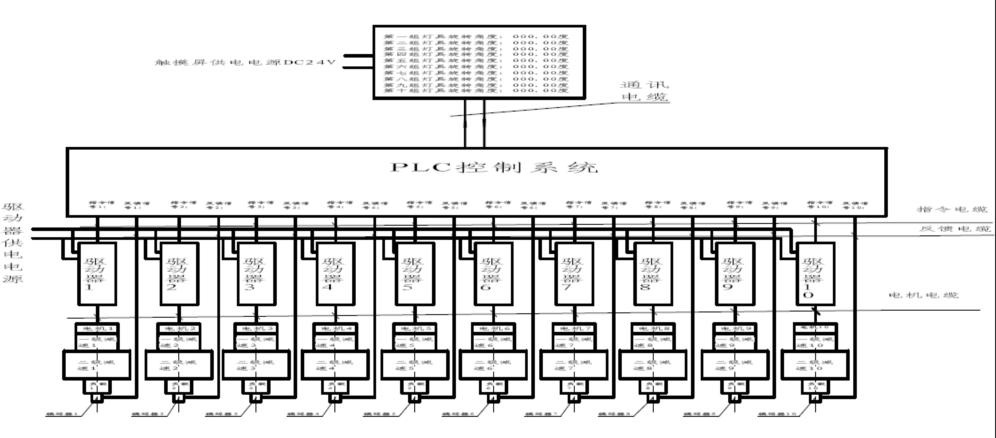 灯阵中所有灯具的安装初始角度为30°,每只单灯可以实现±150mm的左右调节,其为灯具出射主光轴与水平方向的夹角。灯阵支架具有整排的角度调节功能,所有的灯具要求同步调节,调节范围为10°-50°,调节精度±0.4°,角度旋转速度约为7°/min。要求角度旋转过程中灯阵机械结构不挡光。控制方式为远程控制。总的控制结构如下: