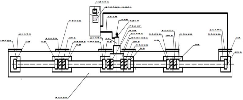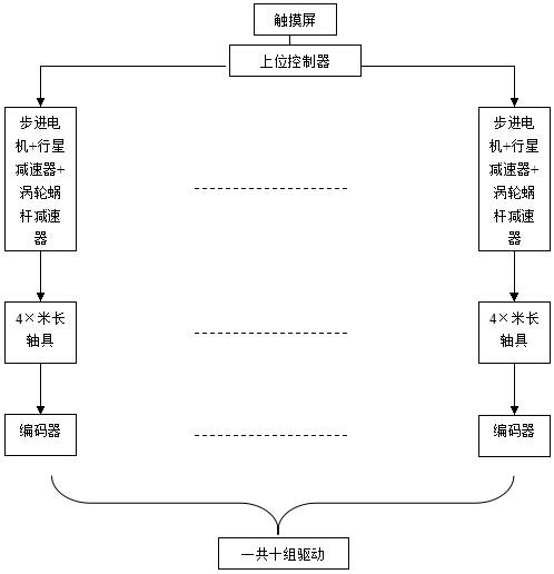 上位控制器控制11套驱动器,11套驱动器分别驱动11台步进电机+11台步进电机分别带动11台行星减速器,减速器后端各带动1台涡轮蜗杆减速器,每台涡轮蜗杆减速器分别带动一根24米长轴具转动的整体运动形式。见下图所示。