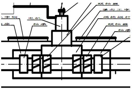驱动部分:采用1台步进电机+1台行星减速器+1台双输出轴涡轮蜗杆减速器驱动1根24米长轴具的驱动方式,鉴于24米轴具具备过大的加工及安装难度,这里将24米长的轴具分成大致相等的两段,每端分别用涡轮蜗杆减速器的一个输出端驱动。见图1所示。