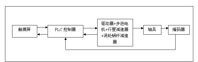 控制部分:采用一组集联PLC控制十套驱动装置的控制方式,同时采用人机界面形式,可以实时控制轴的动作及观察轴的状态。轴的末端装有角度编码器,实时测量轴具转过的角度,在人机界面上显示。总体的控制框架如下面框图3。