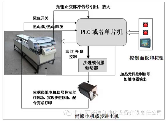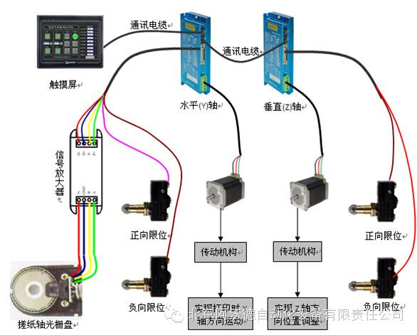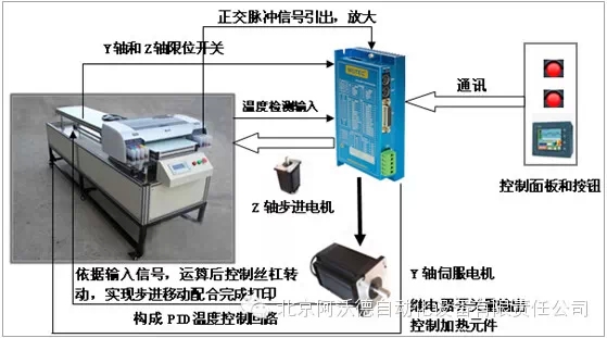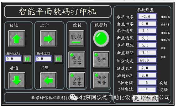 一、本系统中,驱动器供电电压为24VDC~80VDC,上位机触摸屏可以设置的功能包括: (1)设置参数(包括Y、Z轴的JOG速度、回零速度、每转行程、联机脱机切换等); (2)执行JOG、回零操作; (3)查看驱动器工作状态; (4)设置智能步进驱动器细分值。 (5)系统可以设置零点,打印头在任何位置,都可以实现“一键快速回零”。 传统系统采用PLC和通用伺服,配合触摸屏以及开关按钮构建平板打印机辅助控制系统,具有较强的灵活性,但系统构成相对复杂,成本也较高,PLC或者单片机内部需要编程,系统节点也较多,造成潜在的不稳定性。而我们MOTEC 研发团队经过不断努力,不断创新,改造成功的新型(触摸屏+智能步进)平板打印机系统结构简单,不再需要PLC(或单片机),智能步进驱动器可以直接和触摸屏(或者文本控制器)通讯,开关按钮以及现场限位开关可直接接入智能步进的I/O接口。另外,由于采用了高集成度的系统结构,搓纸电机的信号不再通过PLC处理后送到伺服驱动器,系统响应速度较采用PLC也得到明显提高。