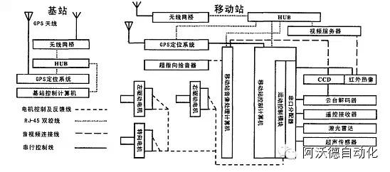 变电站机器人采用了比较明晰的模块化机构设计,以无线电通信和串口分配器为基础,把机器人系统分解成能被单个实现的子系统,各模块之间采用RJ45,RS232等国际通用接口,便于增加和减少功能,设备,有利于机器人的产品化。各模块之间由于交流通道简单,容易实现硬件系统平台的子系统的独立研究开发。机器人本体通过无线通讯系统和基站构成一个整体,如图2所示: