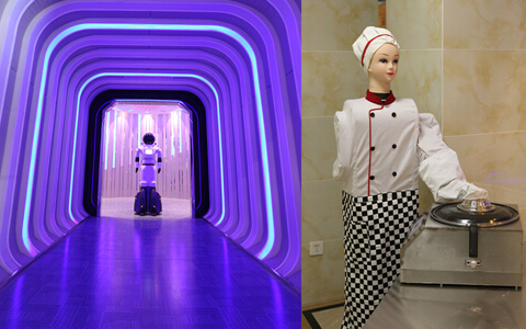 餐厅的布置让人仿佛置身于外太空,极具梦幻色彩,就餐间隙还有机器人提供音乐表演,跳舞机器人随时跳起时尚的舞步,呈现出一幅极具未来色彩的科幻之城。